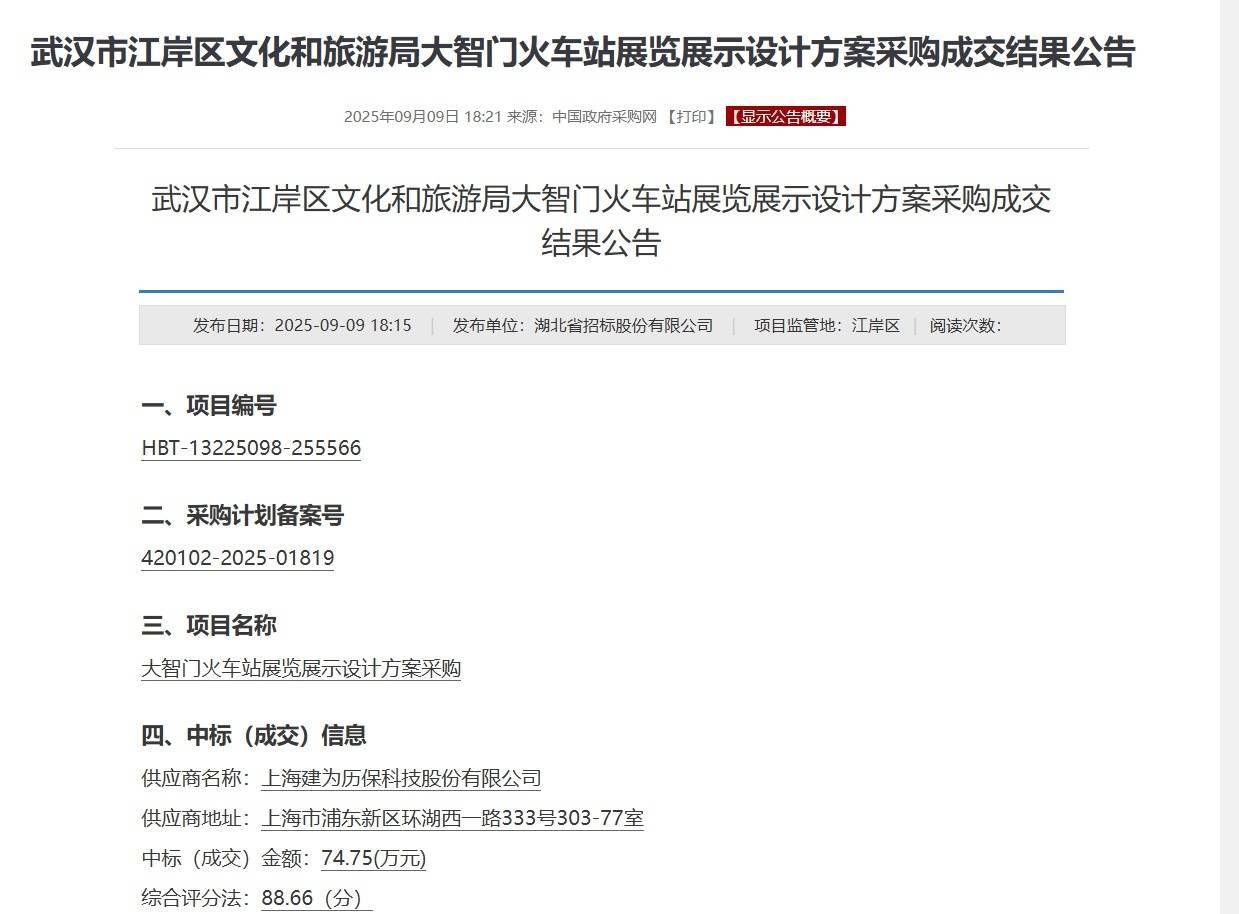 记者查询发现,早在今年9月,湖北省招标股份有限公司已发布了该工程展览展示设计方案的采购成交结果公告。